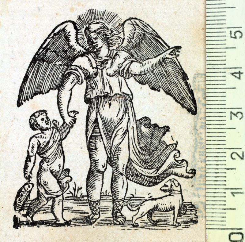 Arcàngel Rafael i Tobies amb un peix a la mà, acompanyats d'un gos