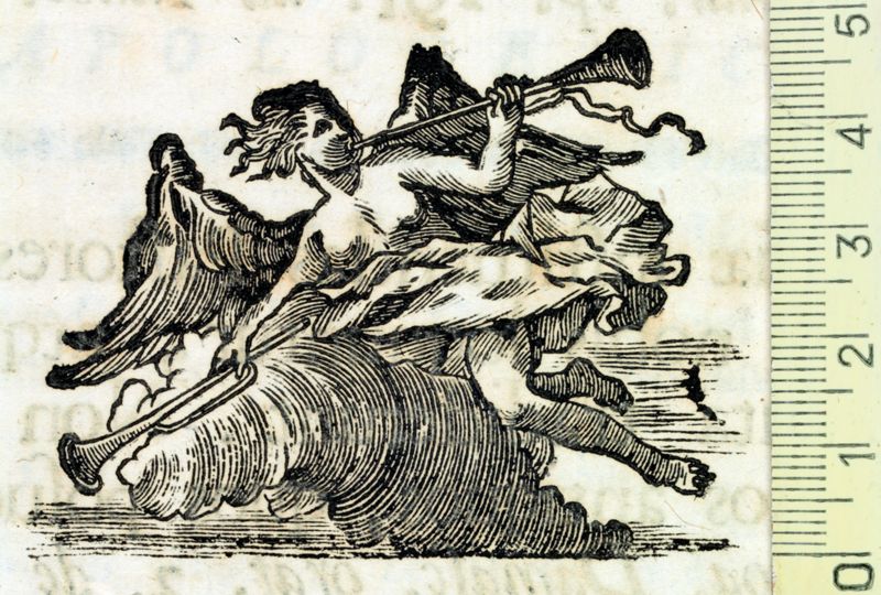 Figura alada femenina (la Fama?) amb una trompeta a la mà esquerra, que fa sonar i una altra a la mà dreta