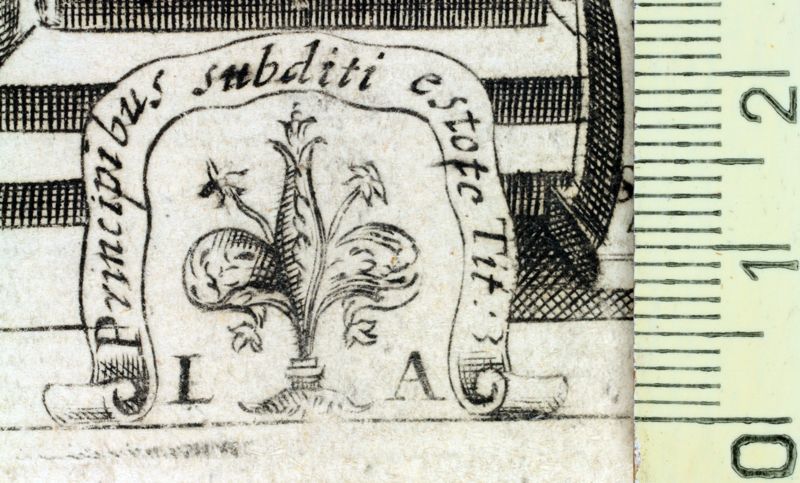 Hem trobat 1 Marca d'impressors que conté el lema Principibus subditi estote Tit.