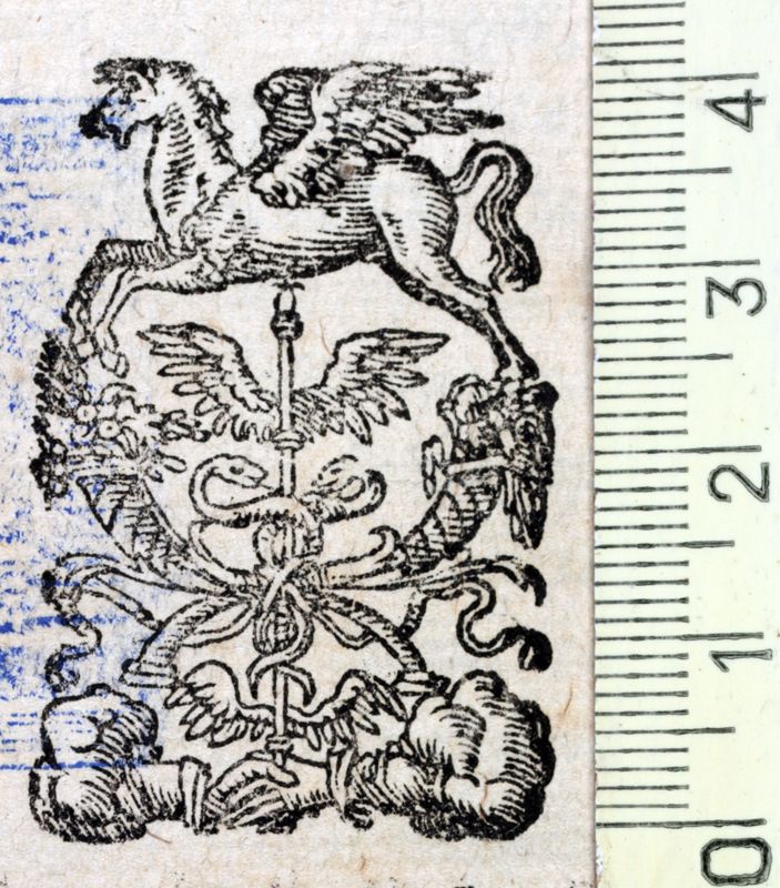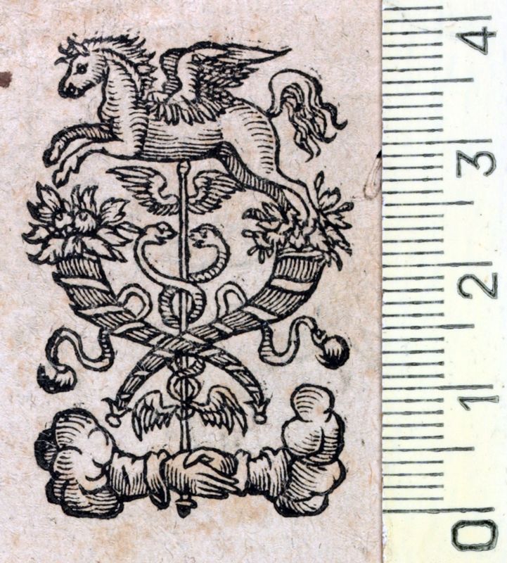 Dues mans que surten d'uns núvols agafen un caduceu al davant del qual hi ha dos corns de l'abundància, i als costats, el monograma d'André Wechel. Al capdamunt, Pegàs volant