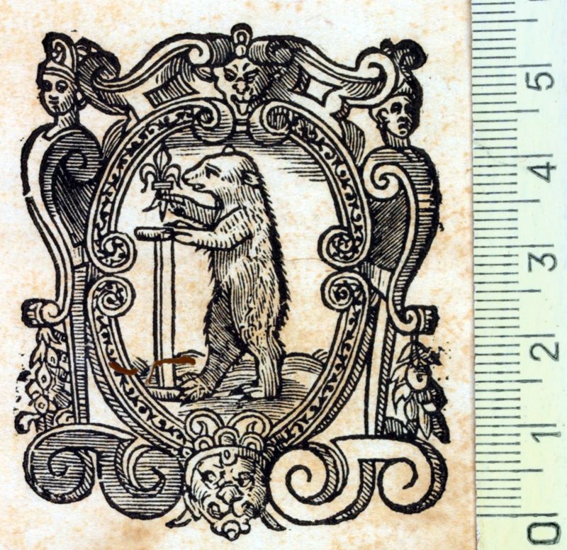 Un ós dret es recolza en un bastó, a la mà dreta un flor de lis