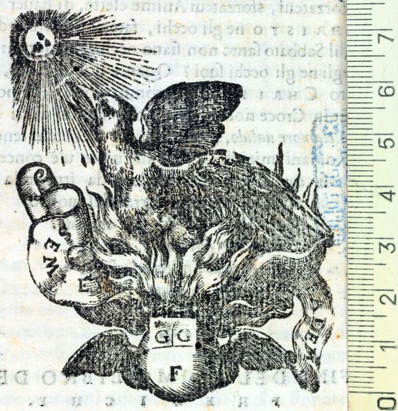 el Fènix, girat cap al sol, enmig de flames que sorgeixen d'un globus alat amb les inicials G.G.F.