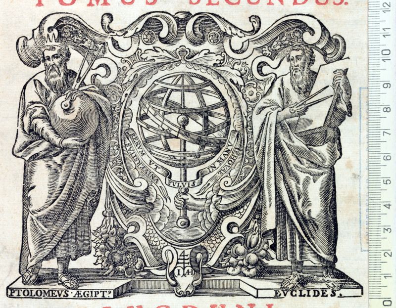 Esfera armil·lar portada per una mà rodejada de núvols entre les figures del geògraf Ptolemeu i del geòmetre Euclides