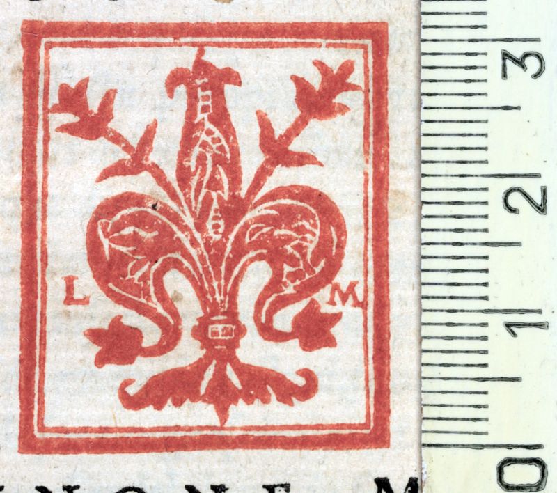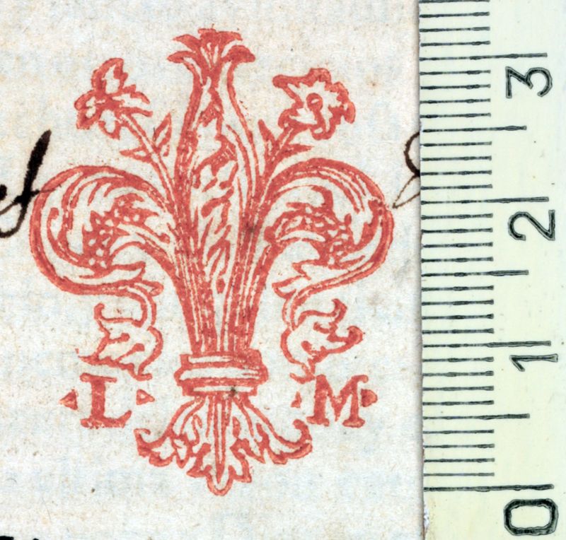 Flor de lis flanquejada per les lletres L. i M. La flor segueix el model florentí, és a dir, el lliri de tres pètals i dos estams entre ells