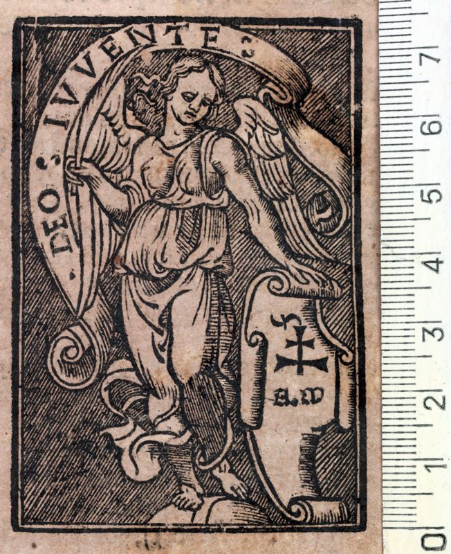 Àngel amb palma a la mà dreta i escut amb las inicials de l'impressor a l'esquerra