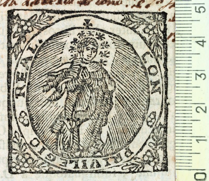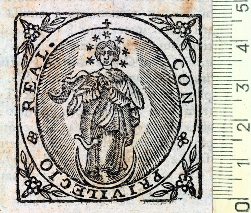 La Immaculada Concepció, patrona de la Universitat amb, al voltant la inscripció "Con privilegio del Rey"