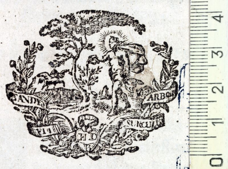 Apol·lo regant un arbre, al fons Pegàs i inicials H.D.B.