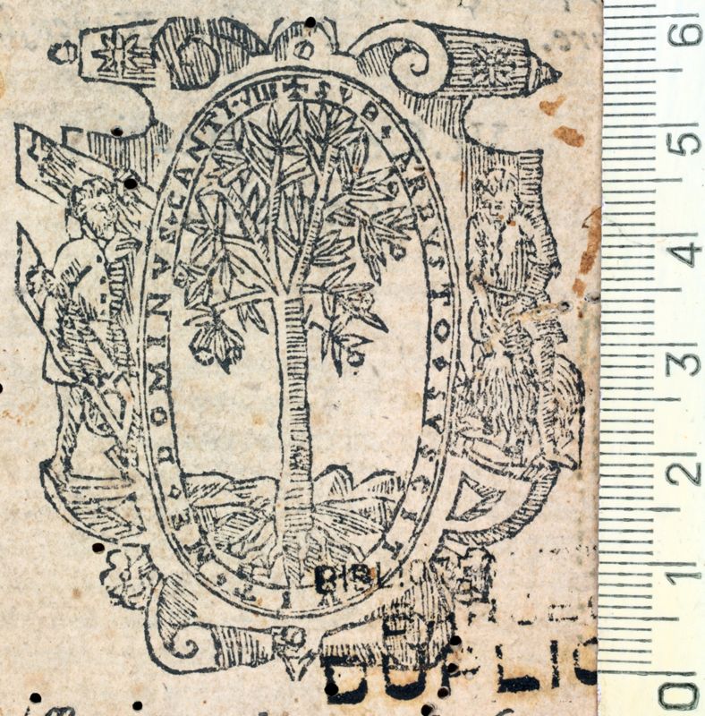 Arbre fruiter en marc ovalat on figura el lema. A cada banda la figura bíblica de Samsó, a l'esquerra amb les portes de Gaza i a la dreta matant un lleó