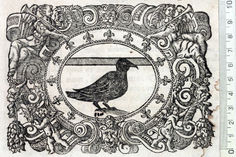 Un corb dins d'un oval amb flors de lis en un marc decorat amb volutes, àngels, putti i màscares
